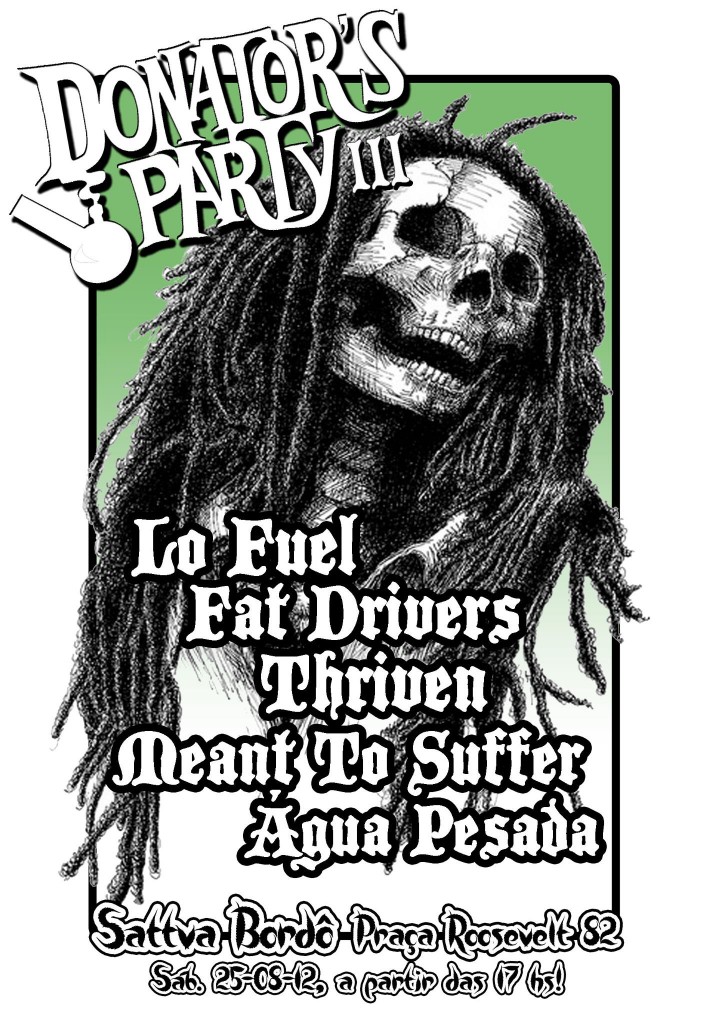 O festival de Stoner Rock paulistano Donator’s Party chega à sua terceira edição. O evento será realizado no dia 25 de agosto, a partir das 17h, no Sattva Bordô, contando com a presença dos grupos Lo Fuel, Fat Divers, Thriven, Meant to Suffer e Água Pesada.