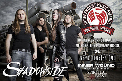A Shadowside, um dos principais expoentes da música brasileira no exterior, acaba de adicionar mais um importante prêmio internacional à sua carreira. O grupo sagrou-se vencedor, na categoria melhor álbum de “Metal/Hardcore”, do “11th Annual Independent Music Awards”, considerado um dos concursos mais importantes da música independente mundial, no quesito voto popular. O grupo concorreu ao lado de Asking Alexandria, 16 Second Stare, Hemoptysis e Scarab.