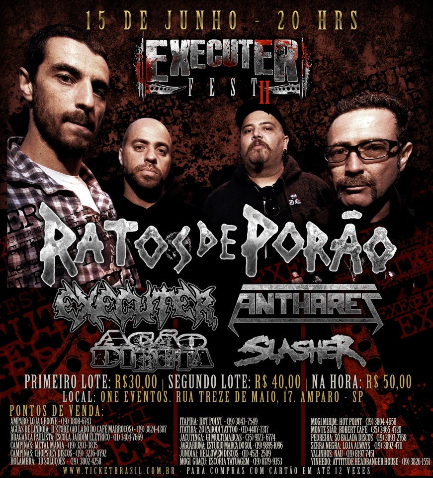 Para essa segunda edição do “Executer fest” os organizadores e também musicos do Executer tem o prazer de anunciar um dos maiores nomes da cena mundial, o Ratos de Porão. A banda vem pela primeira vez em Amparo executar toda sua agressividade ao vivo. Ainda teremos Anthares que é um dos pioneiros do thrash brasuca, Ação Direta que esta comemorando 25 anos de existência e é sem duvida o maior nome do HC brasileiro, Slasher que é uma promessa do thrash e vem de Itapira e os anfitriões do Executer que fara seu primeiro show do ano em Amparo, sua terra natal.