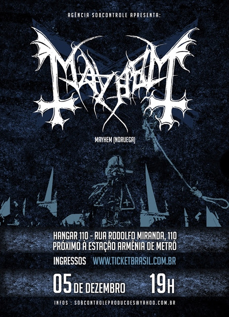 MayhemA Agência Sob Controle recentemente confirmou única apresentação da lendária banda norueguesa Mayhem no Brasil. Show acontece no dia 5 de dezembro, no Hangar 110, em São Paulo. Ingressos à venda. Mais informações abaixo.