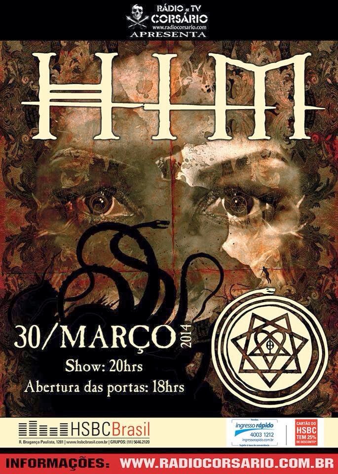 A produtora Rádio & TV Corsário recentemente anunciou a vinda da cultuada banda HIM ao Brasil. A única apresentação do grupo no país acontece apenas no dia 30 de março de 2014, no HSBC Brasil, em São Paulo, mas alguns setores já estão esgotados! Os ingressos de pista normal (1° lote), pista vip (1° e 2° lote) acabaram rapidamente.