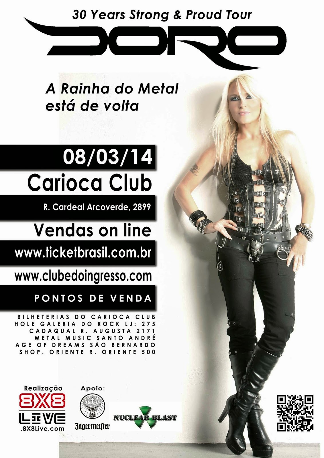 Estão esgotados os ingressos de 1° lote para a apresentação de Doro Pesch, considerada a rainha do heavy metal, em São Paulo. Show acontece, no próximo dia 8 de março, no Carioca Club. 2º lote já esta a venda.