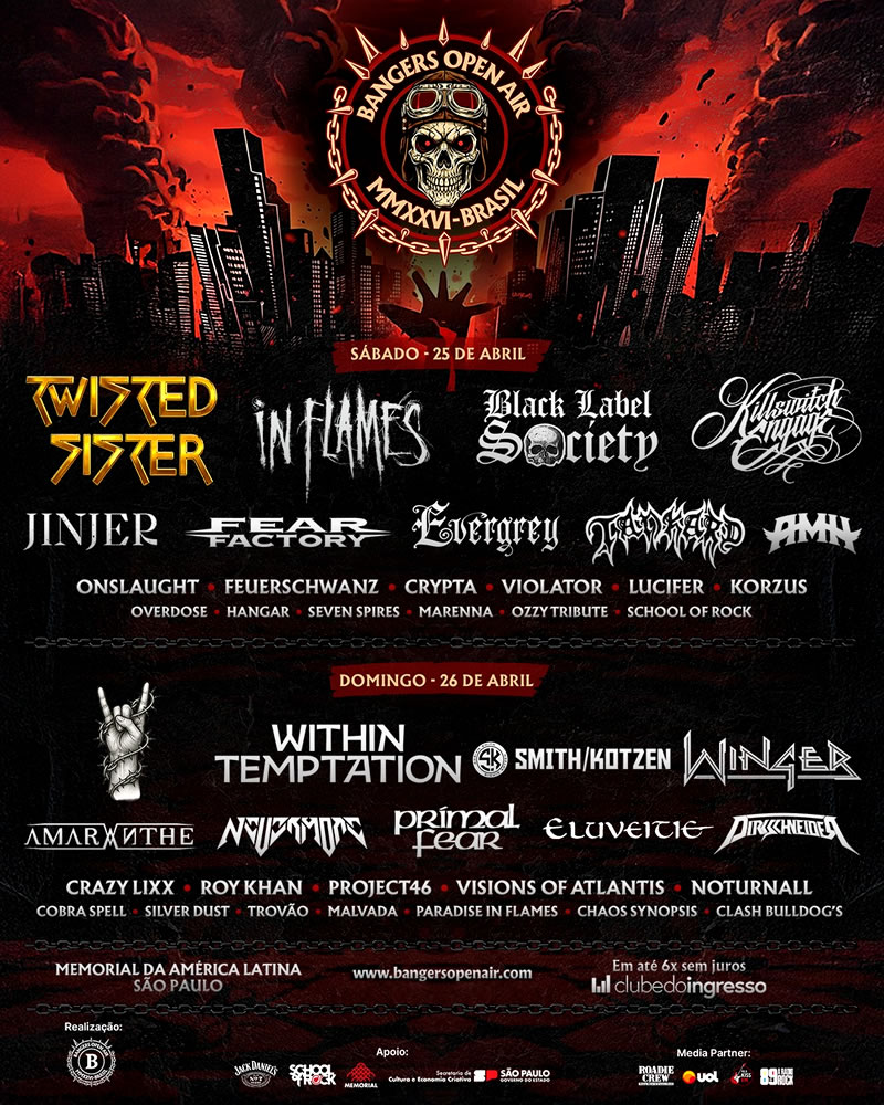 O Twisted Sister, que em 2026 retorna para celebrar cinquenta anos de história com a turnê mundial “Twisted Forever, Forever Twisted”, será um dos headliners do Bangers Open Air! Com mais de 35 milhões de discos vendidos, turnês por mais de 40 países e entradas em dois halls da fama, o grupo americano formado atualmente por Dee Snider (vocal), Jay Jay French e Eddie Ojeda (guitarras), Russell Pzütto (baixo) e Joe Franco (bateria) carrega um legado monumental. Em 2026, fãs de todas as gerações poderão ouvir novamente gritos que marcaram gerações: “I Wanna Rock” e “We’re Not Gonna Take It”. Será a celebração de meio século de uma das bandas mais emblemáticas do hard rock e heavy metal e que deixou obras definitivas como ‘Under the Blade’ (1982), ‘You Can’t Stop Rock ‘n’ Roll’ (1983), ‘Stay Hungry’ (1984), ‘Come Out And Play’ (1985) e ‘Love Is for Suckers’ (1987), além de ‘Still Hungry’ (2004) e ‘A Twisted Christmas’ (2006).